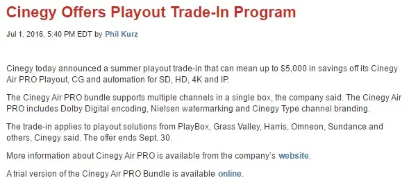Read the Article – Cinegy Offers Playout Trade-In Program